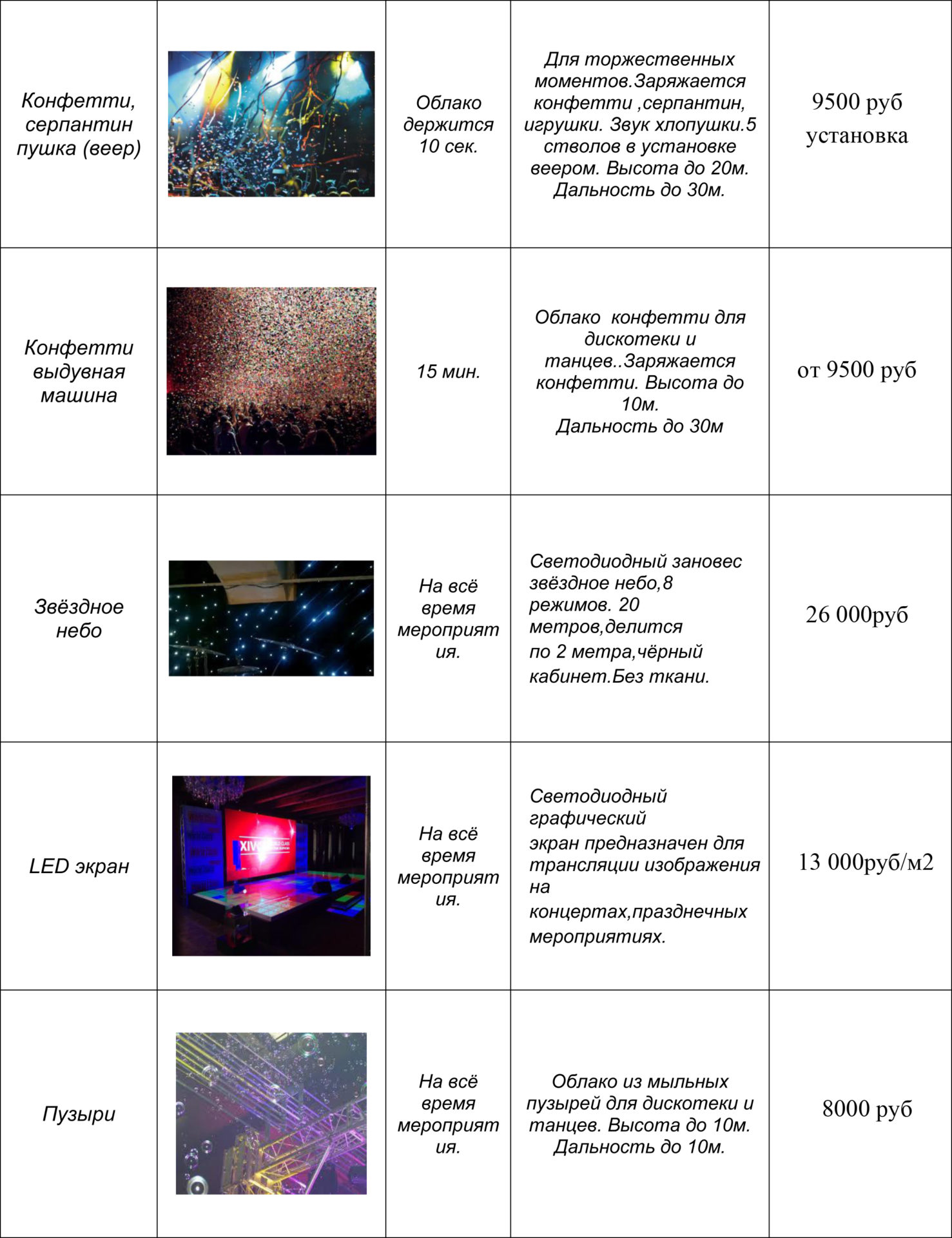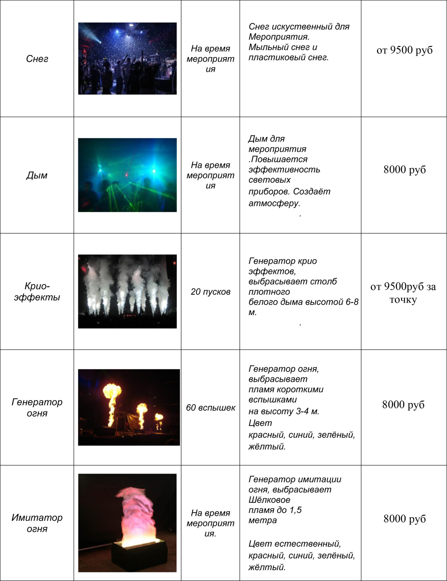 А также у нас большой ассортимент спецэффектов на любое мероприятие, любого масштаба: тяжелый дым, конфетти, серпантин, мыльные пузыри, снег, зальные фонтаны, звездное небо, крио-эффекты, генераторы и имитаторы огня и многое другое.