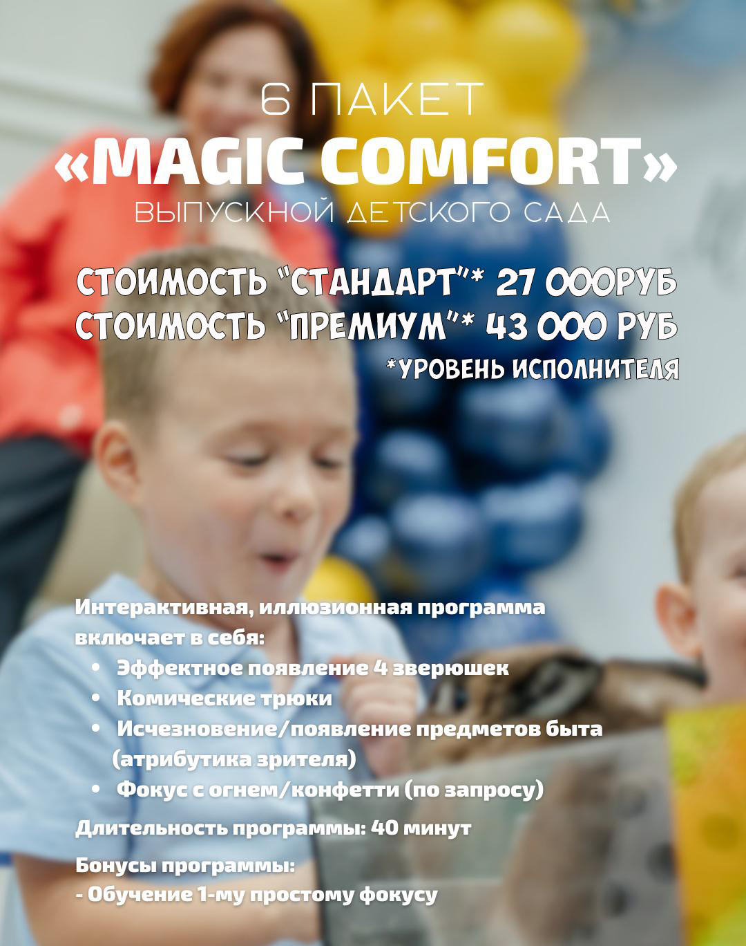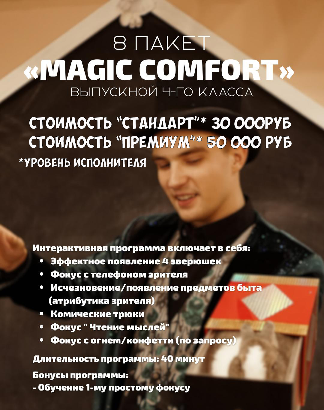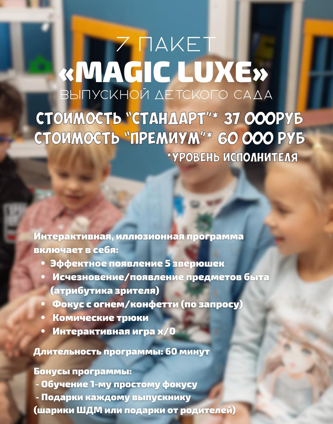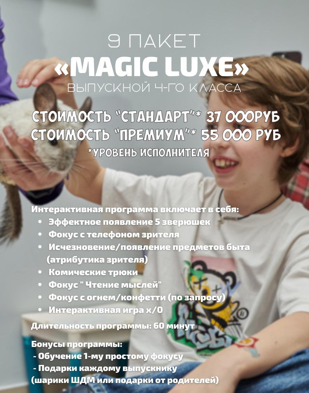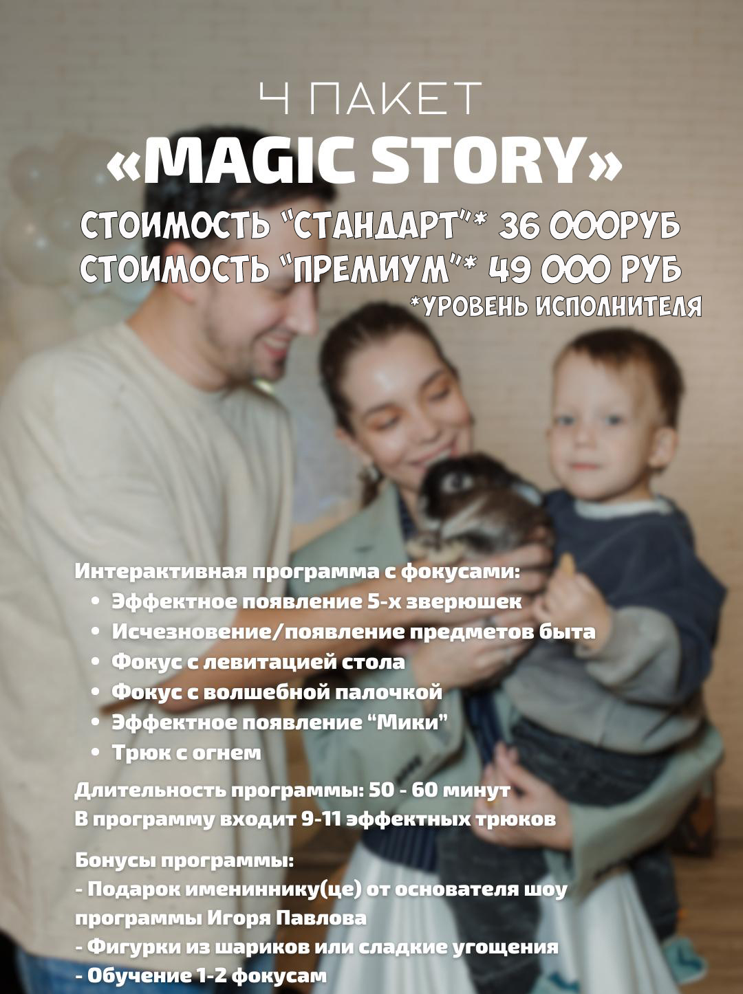 Если вы до сих пор не верите в волшебство, то мы готовы доказать вам обратное! Предлагаем магическое шоу, в котором вы увидите микромагию (с вашим участием) — это различные манипуляции с шариками, монетами, верёвками, платками и картами, появление настоящей живой рыбки прямо у вас в руках! Настоящее чтение мыслей, трансформацию тростей и даже ментальные фокусы! А так же в программе: снежный шторм,сценическая магия, появление и исчезновение предметов и животных (голубь, рыбка, геккон, черепаха,шиншилла,кролик)! Программа сопровождается яркими вспышками,искрами,огненным пламенем и конфети. Магическое шоу станет отличным дополнением к любому празднику и подарит каждому незабываемые волшебные эмоции!