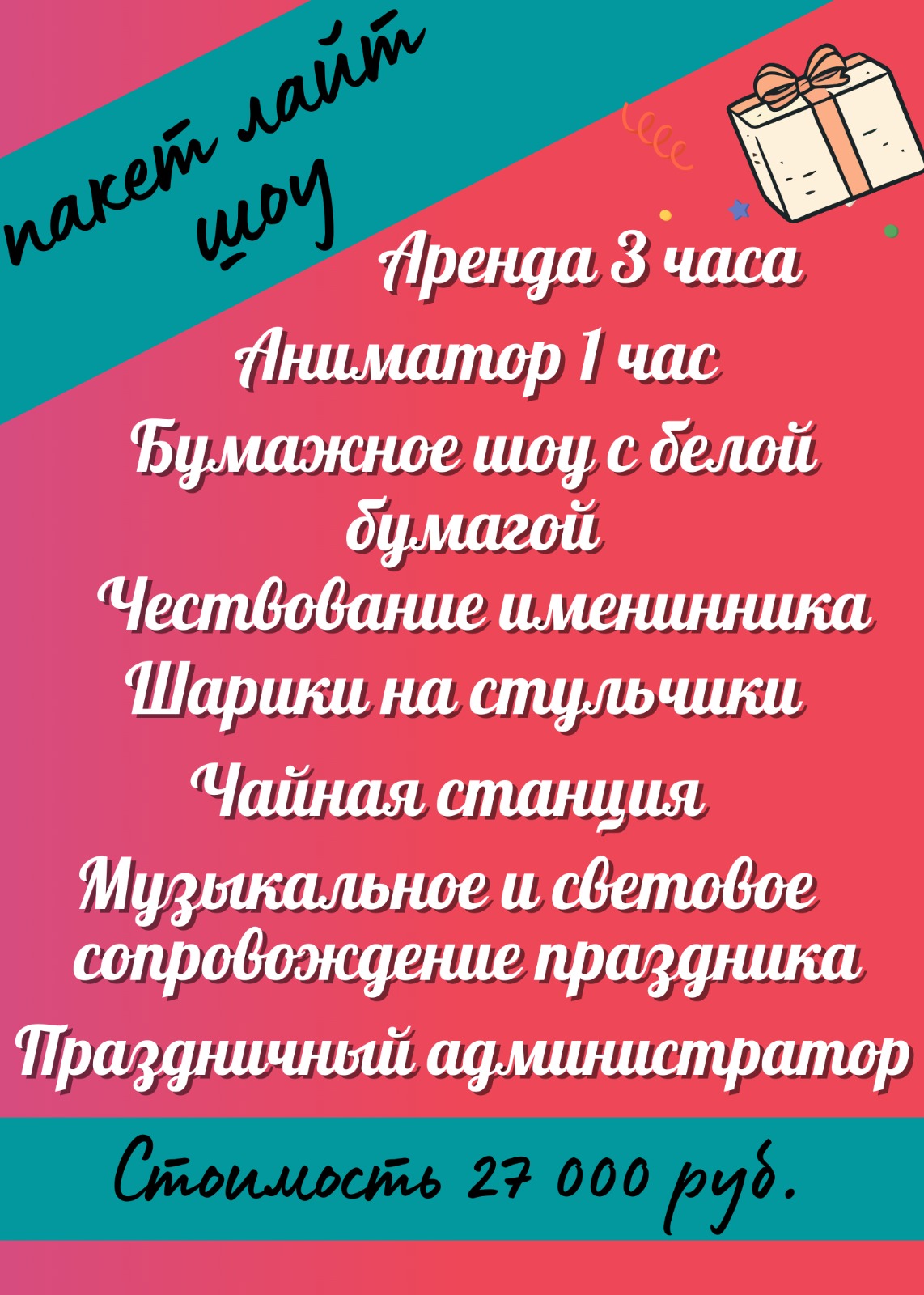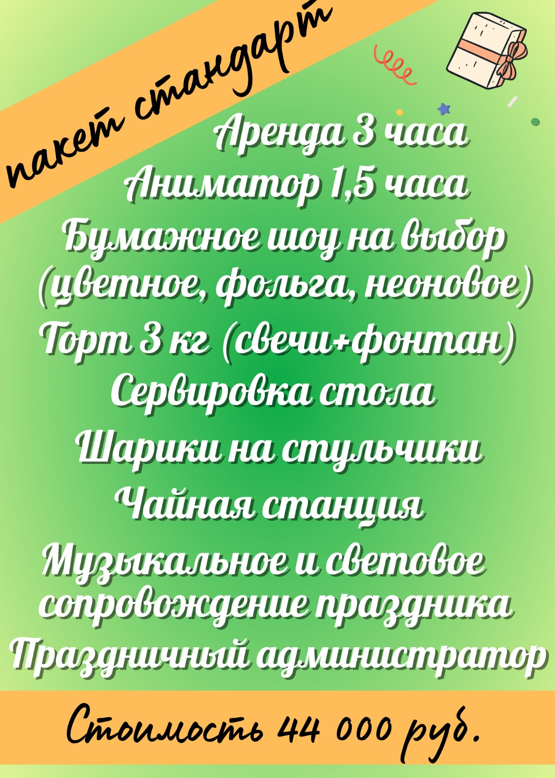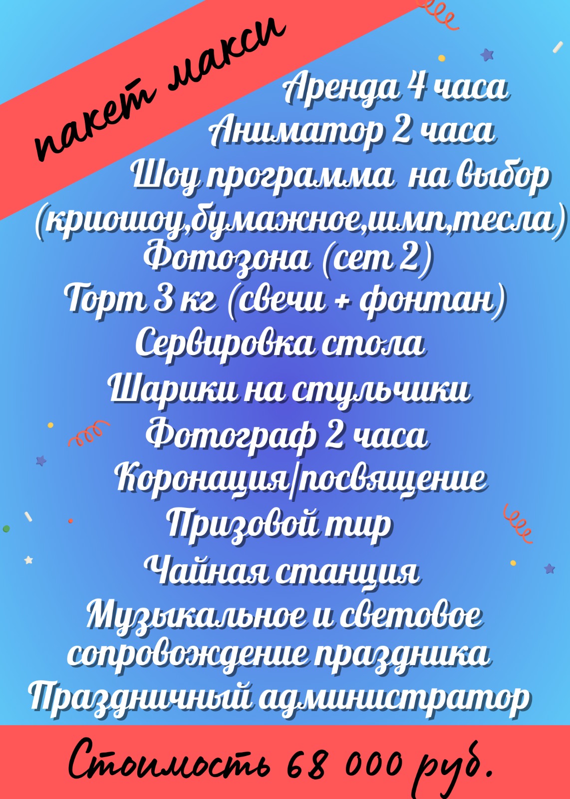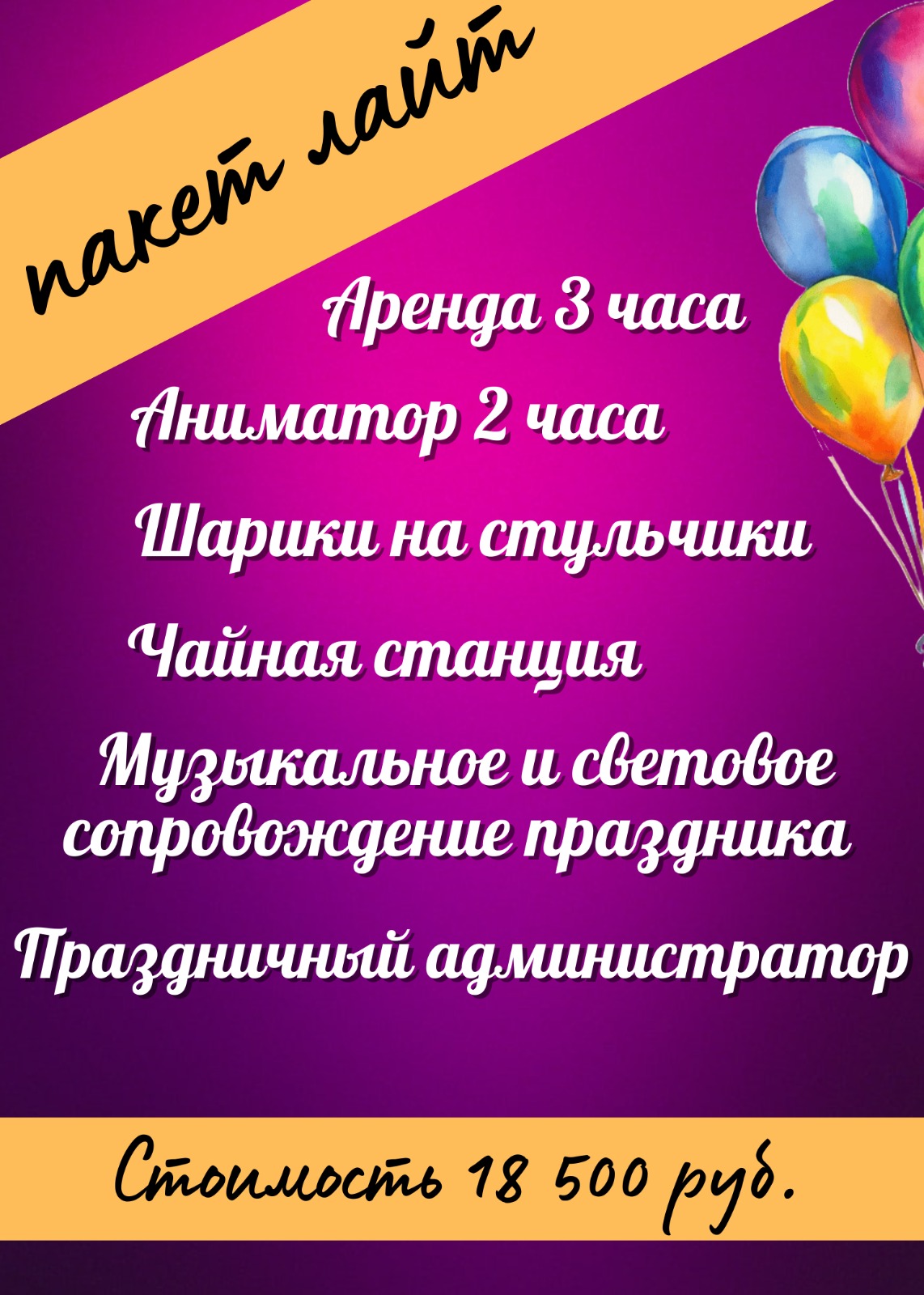 -услуга праздничного администратора, задачей которого служит полное освобождение клиента от хлопот по подготовке праздника. Праздничный администратор подготовит оформление зала, накроет стол по заданию заказчика, а также нарежет торт, примет и разложит пиццу и будет сопровождать праздник на протяжении всего времени аренды(сервировка, украшения и еда в стоимость аренды не входит);