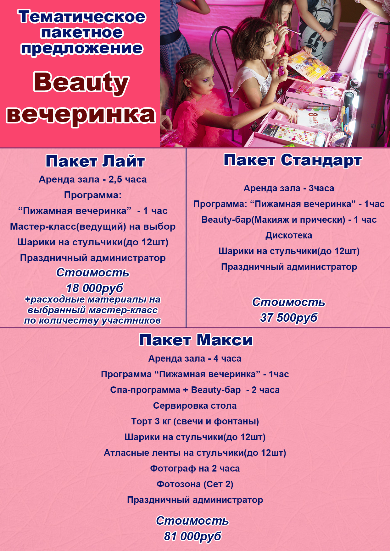 Стоимость аренды помещения по праздник 3500руб/час.