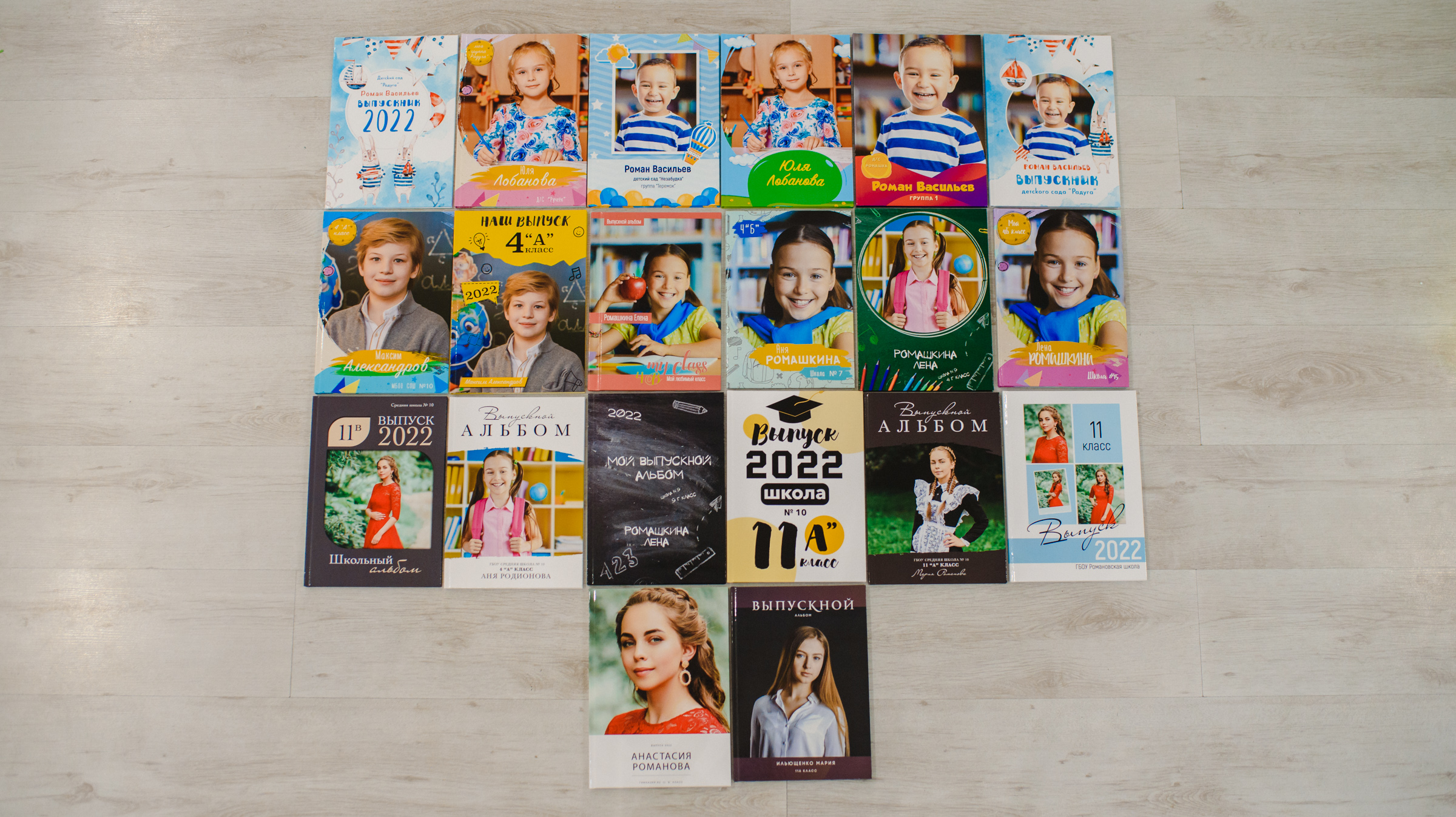 Стильные, яркие, сочные выпускные фотоальбомы для детских садов и школы. Мы подготовили для Вас 21 вариант шаблонов на выбор. Все фотоальбомы индивидуальные, с фотографиями вашего ребенка на обложке и разворотах. Стоимость альбомов от 1500руб.